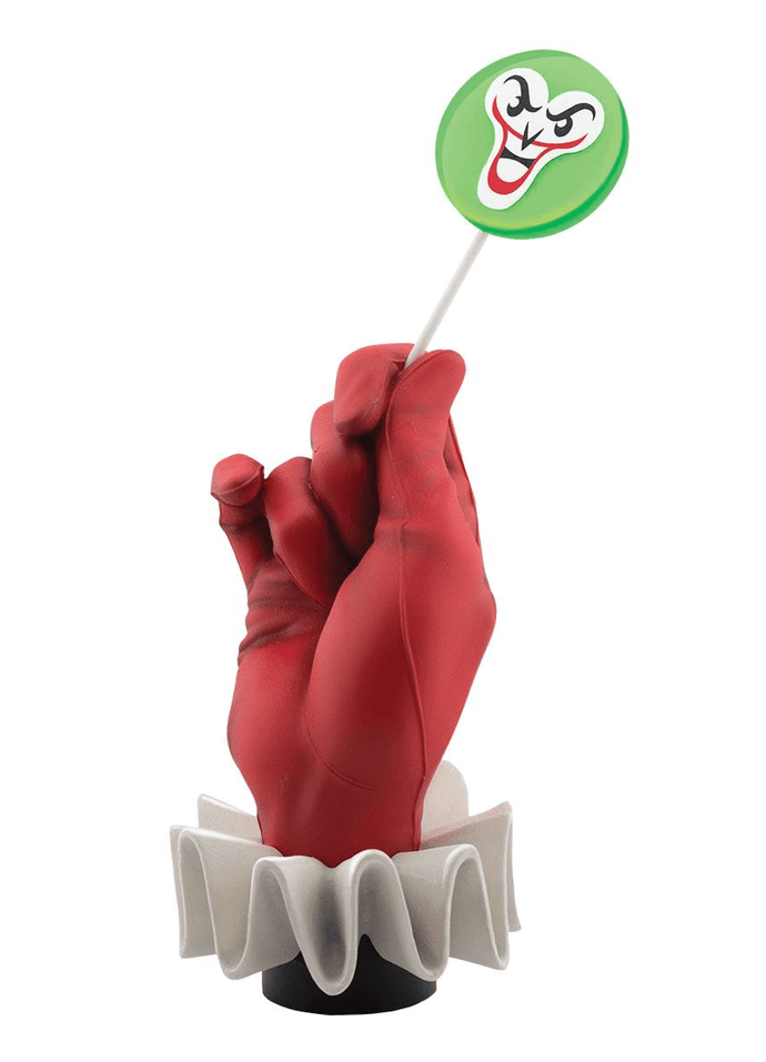 Harley Quinns behandschuhte Hand, die einen Lutscher mit dem Gesicht ihres lächelnden Schatzes, dem Joker, hält.