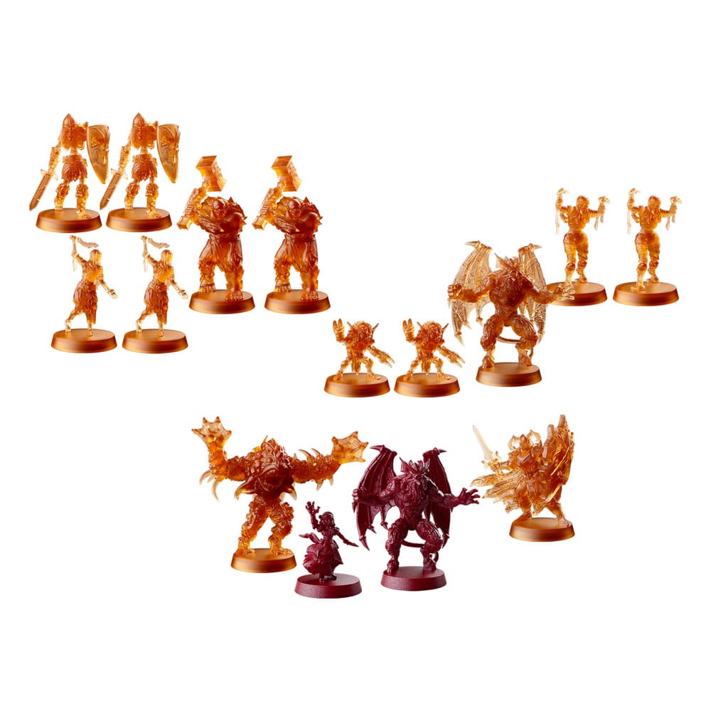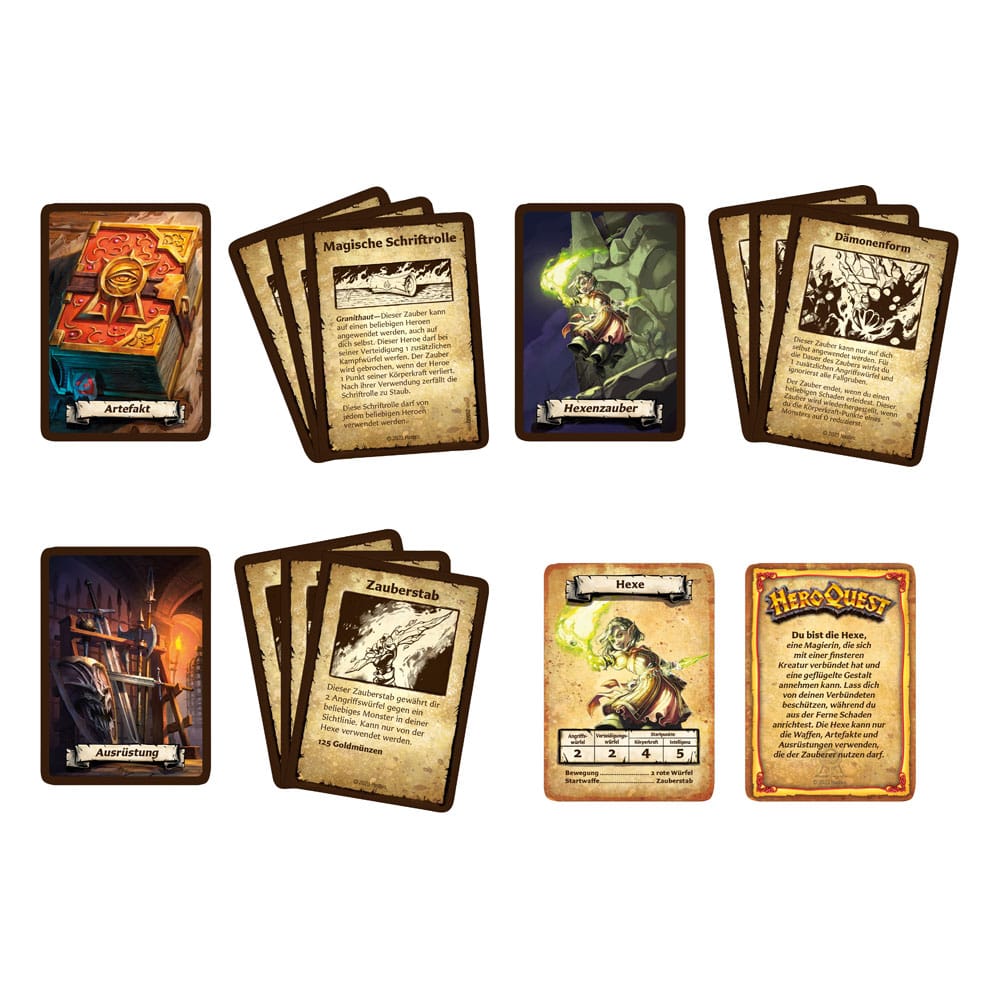 Enthält ein Buch der Herausforderungen mit 13 Abenteuern, 15 detaillierte Miniaturen, 14 Karten und 6 Würfel.