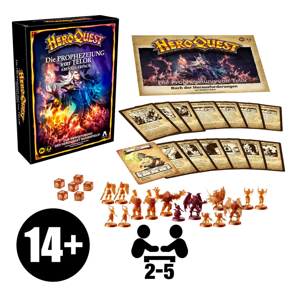 Mysteriöse Kräfte stören Mentors Magie. In dem HeroQuest Abenteuerpack Die Prophezeiung von Telor kann die Geschichte von HeroQuest weitergeführt werden. Es führt die Spieler durch 13 Herausforderungen, um die Geheimnisse zu lüften, die das Amulett der Weisheit und die Prophezeiung von Telor umgeben. Obwohl der Zauberer Melar seit langem verschwunden ist, ist bekannt, dass er mit der Schreckensmagie experimentierte. Nach seinem Verschwinden konnte lediglich das Amulett der Weisheit gefunden werden. In der Rolle von mutigen HeroQuest Heroen gilt es, in Melars Labyrinth einzudringen und den Machenschaften ein Ende zu setzen, die hier im Spiel sind. Der Pack enthält 15 detaillierte Miniaturen, 14 herrlich gestaltete Karten und ein Buch der Herausforderungen sowie 6 Würfel. (HeroQuest Basisspiel erforderlich. Separat erhältlich.) Das Spiel ist unbegrenzt wiederholbar und sogar eigene Abenteuer können erfunden werden. Hier können Freunde zusammengetrommelt werden. Für 2 – 5 Spieler ab 14 Jahren.