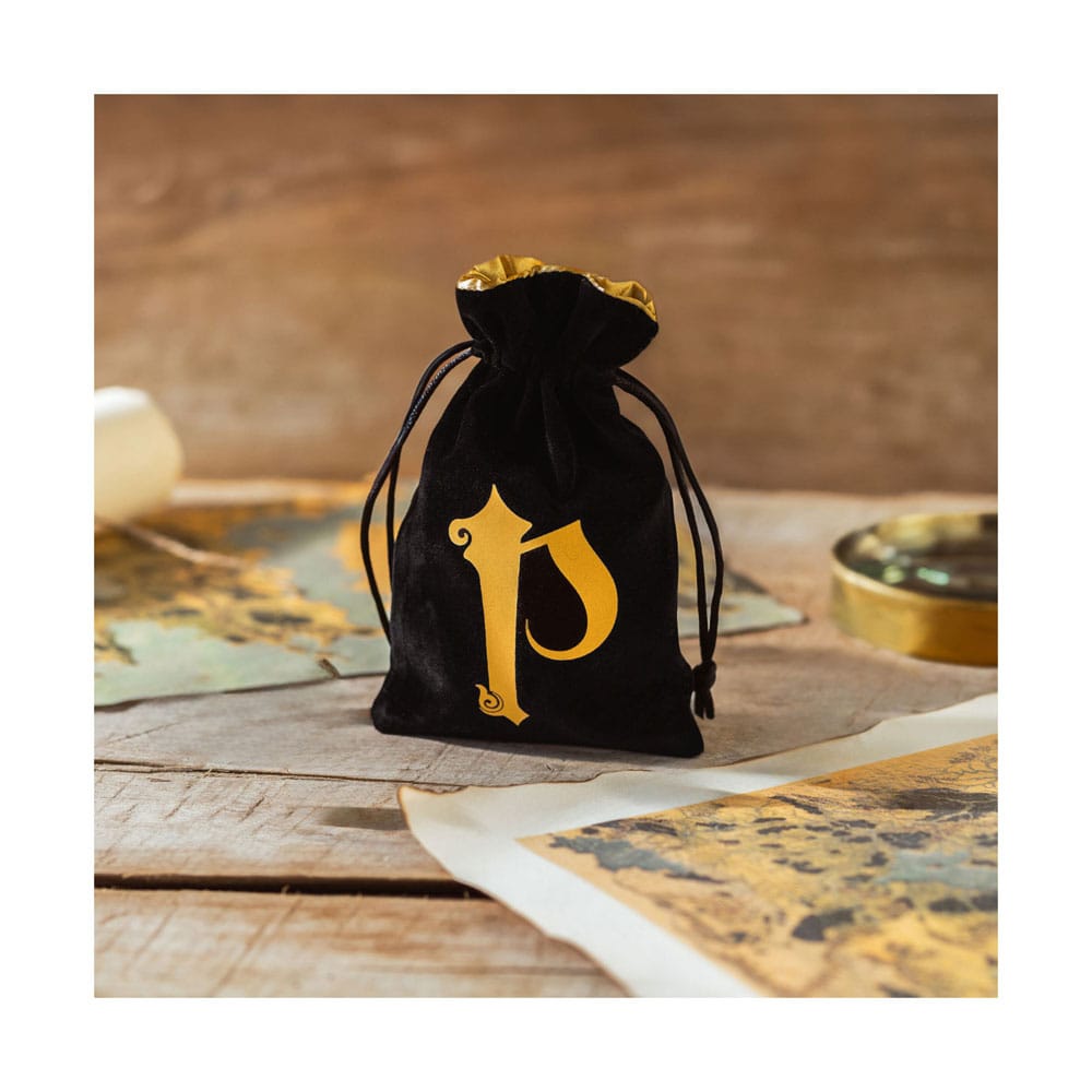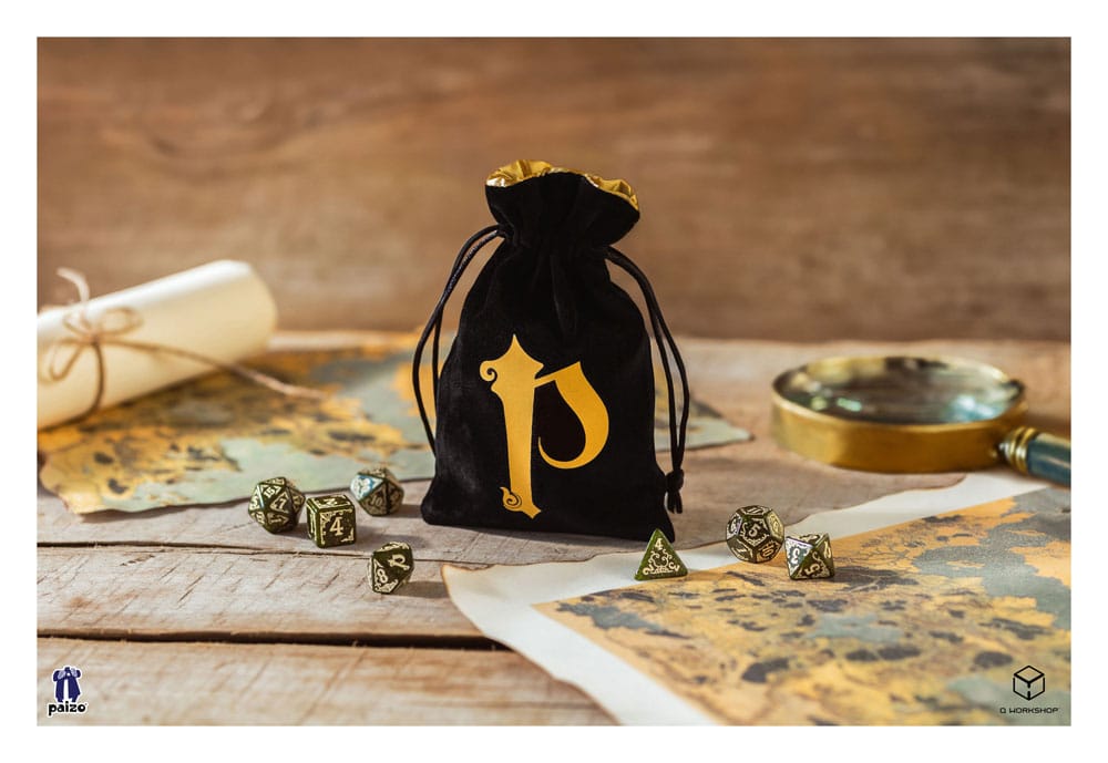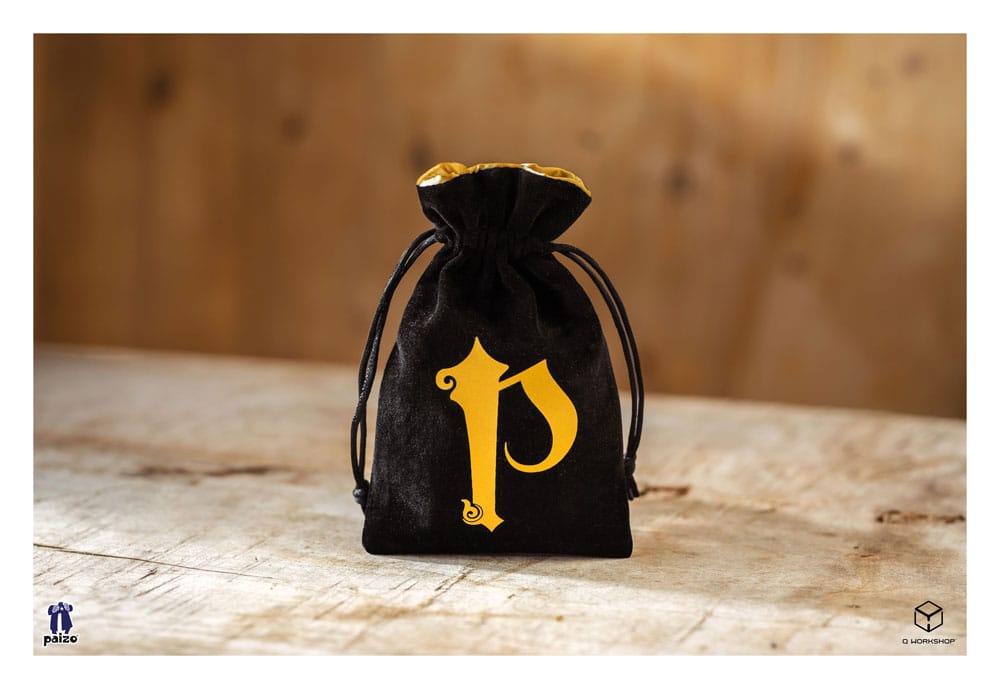 Dieses aussergewöhnliche Spielrequisit ist eine aus robustem Velours gewebte Tasche mit Satinfutter, die den Polyedern Komfort und Sicherheit zugleich bietet. Sie wird mit strapazierfähigen Polyesterschnüren verschlossen, damit sie nicht umherwandern können. Das durchgängig elegante Farbthema aus schwarzem Material mit goldenem Aufdruck flösst Respekt und Stil ein, besonders wenn das bekannte Pathfinder-Logo die Vorderseite ziert.