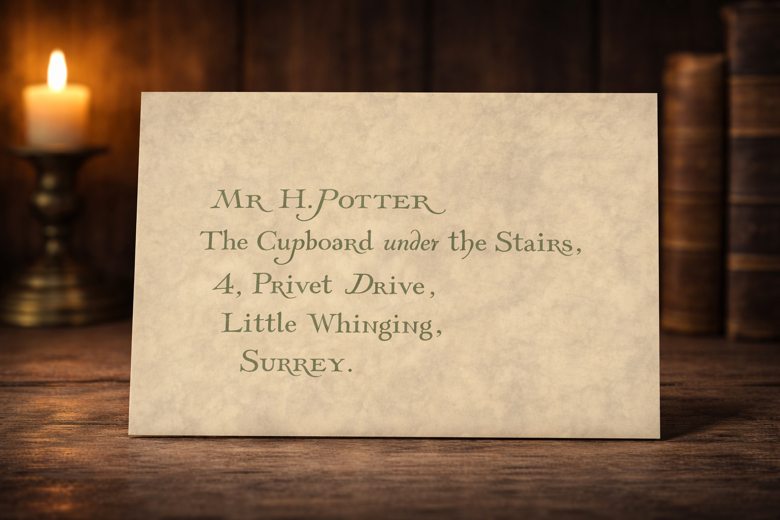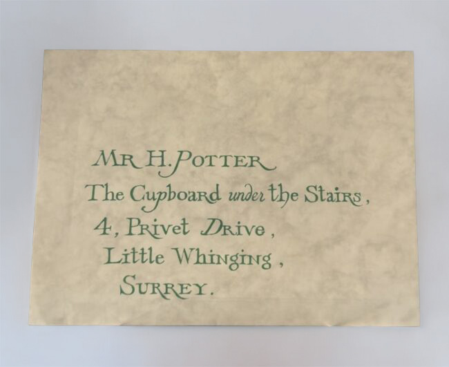 Dieser leere Umschlag aus marmoriertem Papier ist adressiert an „Mr. H. Potter, Der Schrank unter der Treppe (Mr. H. Potter, The Cupboard Under the Stairs)“, wobei die Adresse der Dursleys auf der Vorderseite aufgedruckt ist und auf der Rückseite das Hogwarts-Wappen, sowie das Siegel (bedruckte Version) zu sehen sind.