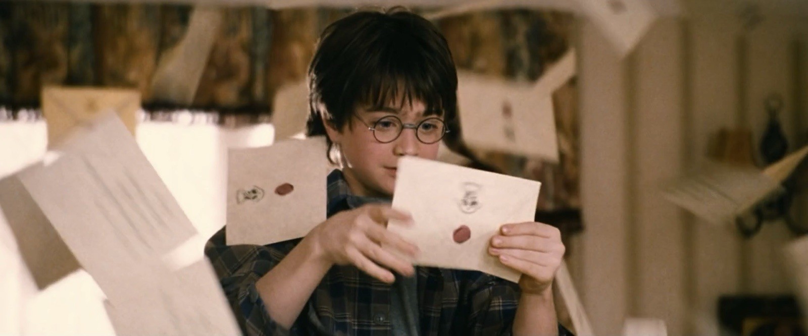Harry Potters (Daniel Radcliffe) Zulassungsbrief für Hogwarts aus Chris Columbus’ „Harry Potter und der Stein der Weisen“.