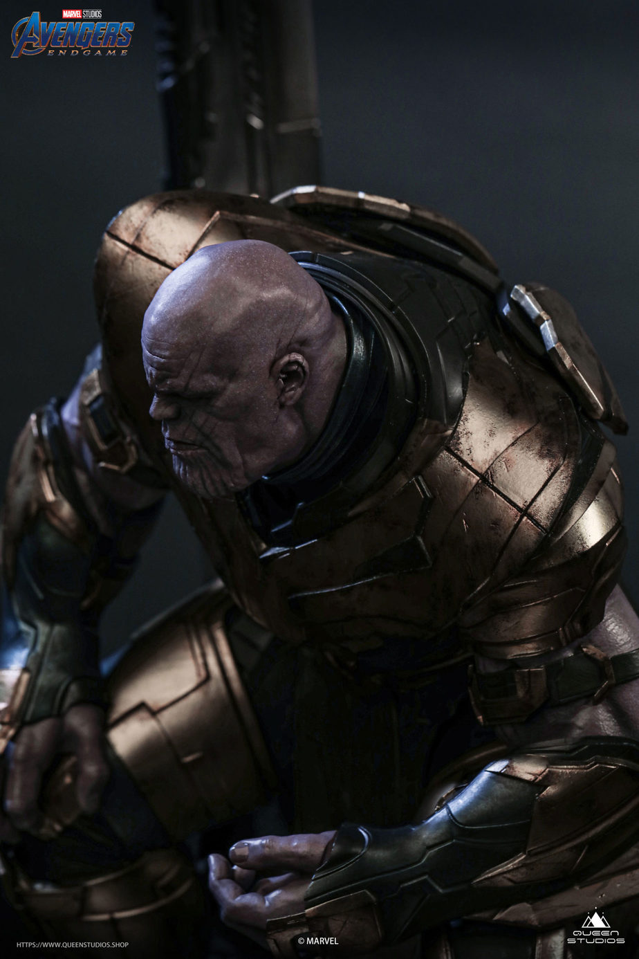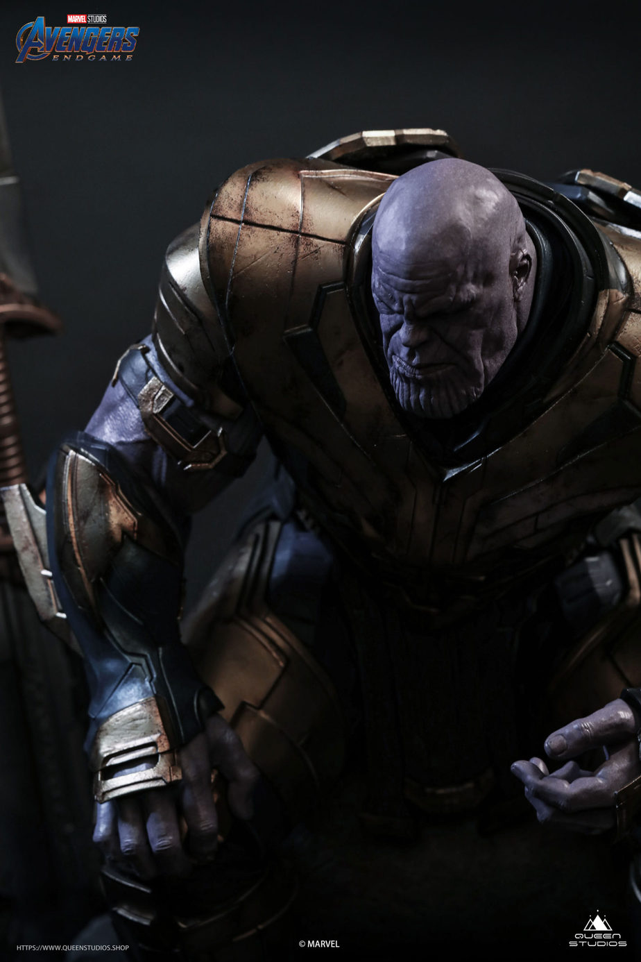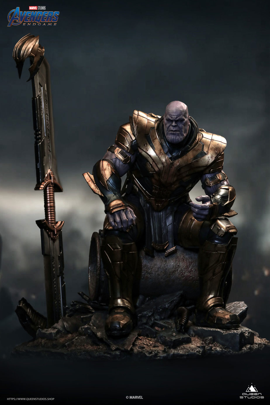 Queen Studios präsentiert stolz ihr neustes Meisterwerk von Thanos aus dem Blockbuster „Avengers Endgame“. Eine Version der Statue zeigt Thanos, tief in Gedanken versunken mit einem ernsten Ausdruck im Gesicht. Die Premium Version kommt mit einem 2ten Portrait, welche diese rare Sekunde des Titanen mit seinem ironischen Lächeln zeigt.