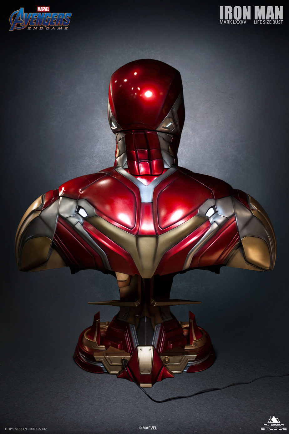 Aus Queen Studio’s Reihe mit lebensgroßen Büsten kommt dieses hochwertige Sammlerstück vom MK85 aus dem Marvel Blockbuster „Avengers – Endgame“. Die detailreiche Büste aus hochwertigem Polystone ist ca. 81 x 65 x 43cm groß und wird inkl. Namensplakette, styropor-geschützt, im bedruckten Karton geliefert.