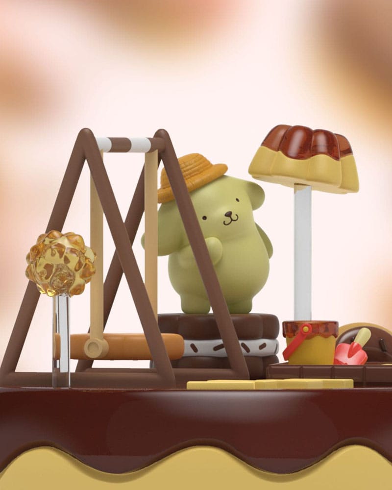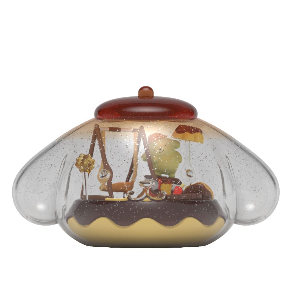 Das 12,25 cm grosse Diorama zeigt Pompompurin, der auf einer Schokoladenschaukel sitzt, umgeben von Dessert-Elementen wie einer Pudding-Laterne, einer Bank aus Schokoladenkeksen und einem Tablett mit süssen Leckereien. Die glitzernde Kuppel funkelt über einem Donut-förmigen Sockel, der mit Schokoladenglasur beträufelt ist, und schafft eine reichhaltige, warme Ästhetik. Das Set enthält lustige, abnehmbare Accessoires, darunter ein Pudding-Dessert, Schokoladenstücke und Karamell-Akzente, die perfekt zu Pompompurins Liebe zu allem Süssen passen.