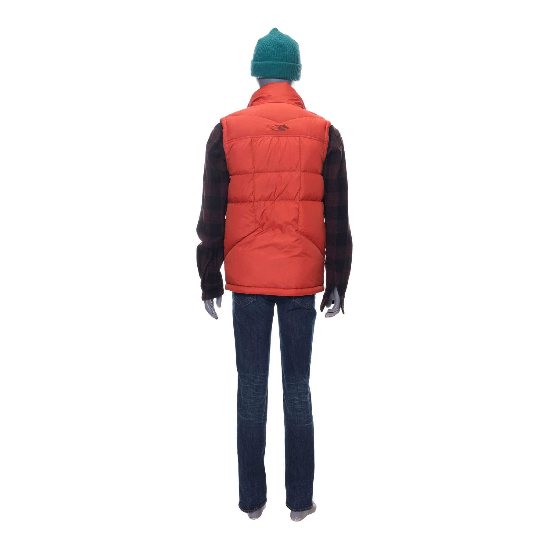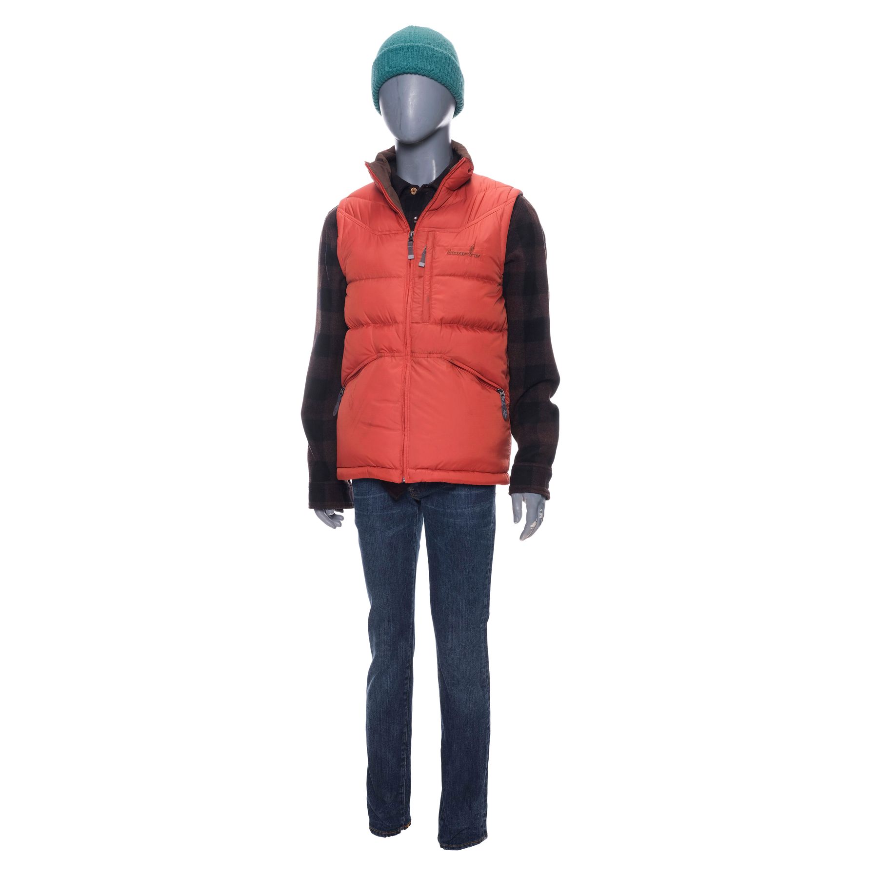 Dieses collectable besteht aus einer orange-braunen Bonfire-Daunenweste aus Polyester-Nylon (Größe S); einem schwarz-braun karierten Steven-Alan-Flanellhemd aus Wolle (Größe L); einem grauen Baumwollhemd von The Quality Mending Co. (Größe S) mit der Aufschrift „3“; einer blauen Levi’s-Jeans aus Baumwollmischung (Größe W30/L32); einer grünen Wollmütze; und einem handgeschriebenen Produktionsetikett. Das Hemd weist produktionsbedingte Gebrauchsspuren auf, und die Mütze weist ausgefranste Stellen auf.