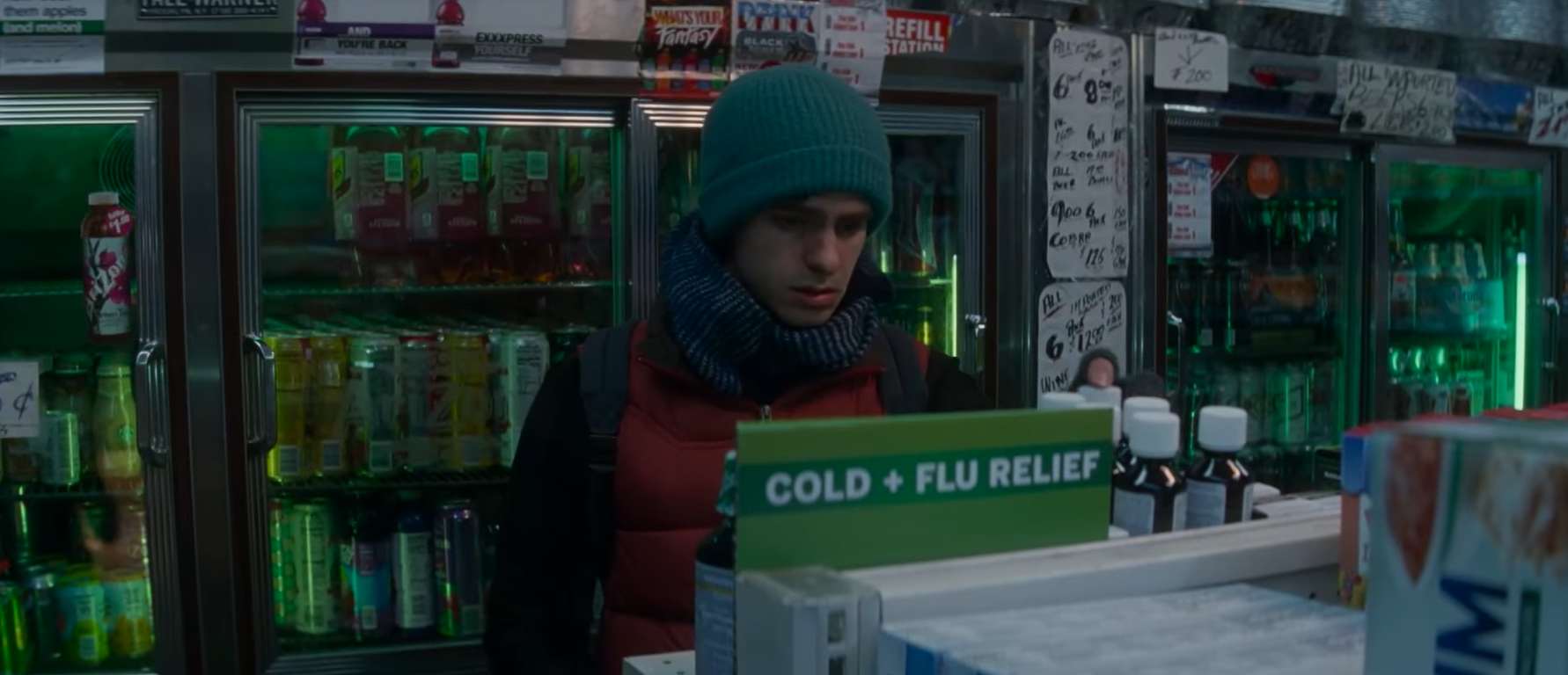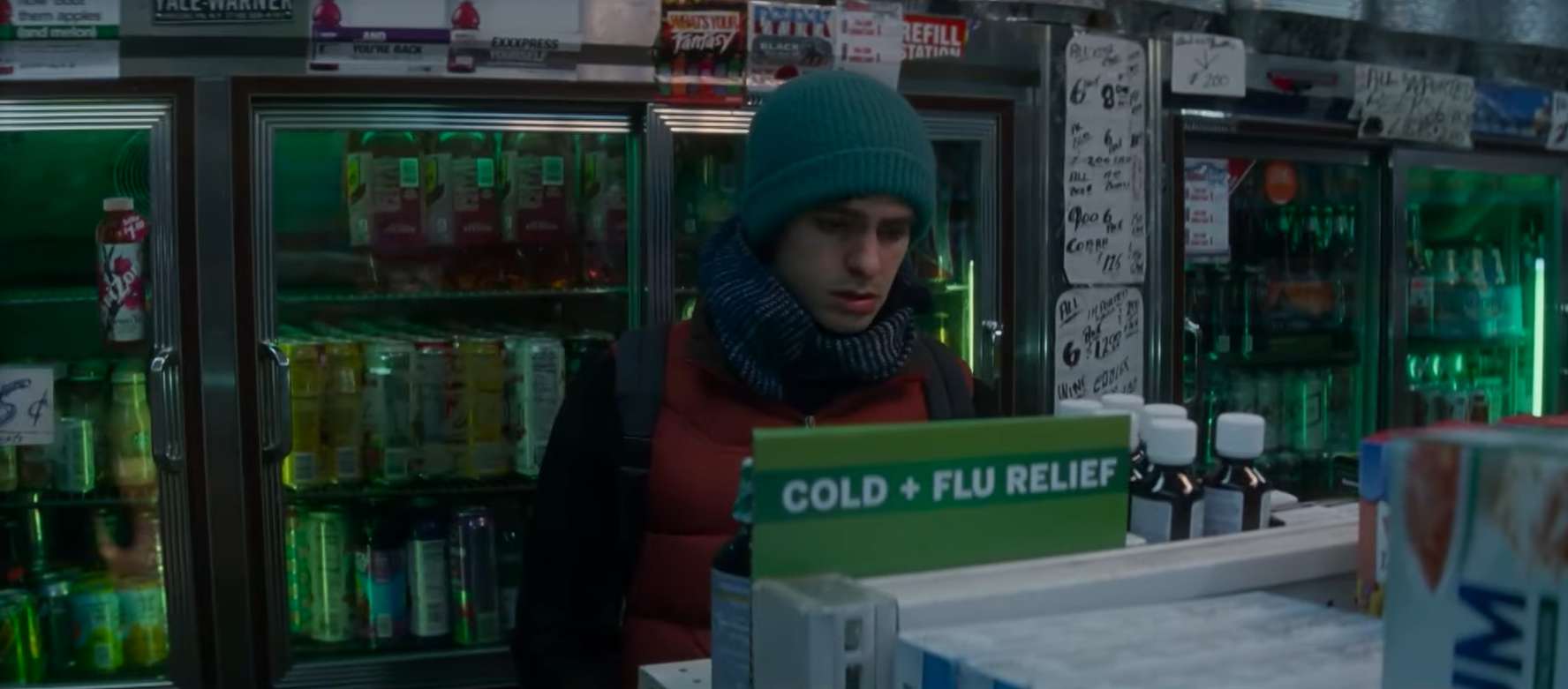 Peter trug sein Kostüm, als er in eine Drogerie in der Nachbarschaft ging, um sich Erkältungsmedizin zu kaufen, da er während seiner Tätigkeit als Spider-Man erkrankt war.