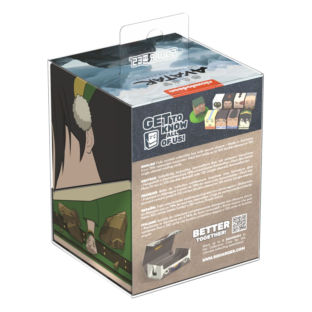 Sammelbare Box zur Aufbewahrung von TCG-Decks, Tabletop-Zubehör und/oder Sammlerstücken. Der Toph Squaroe aus der Avatar: The Last Airbender™-Edition bietet als Deck-Box benutzt Platz für bis zu 100 Spielkarten in doppelter Schutzhülle. Squaroes werden aus 78% erneuerbaren Rohstoffen hergestellt und passen perfekt in das separat erhältliche Collectors Case.