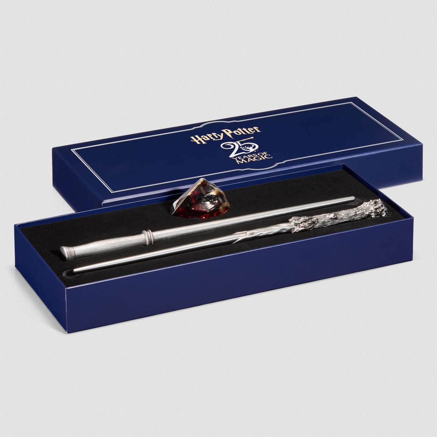 Beide Zauberstäbe sind aus hochwertigem Harz gefertigt und mit einem bezaubernden antiken Silberfinish versehen. Das Set wird in einer blauen Sammlerbox mit goldenen und silbernen Folienakzenten zum 25-jährigen Jubiläum geliefert und enthält außerdem eine originalgetreue Replik des Stein der Weisen.