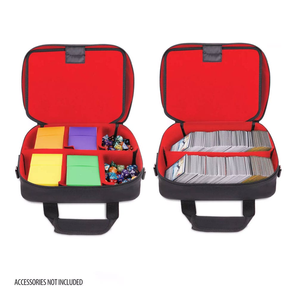 Kartenkoffer mit individuell anpassbaren Fächern für Karten, Spielmatte, Würfel, Notizbücher und weiteres Zubehör.
