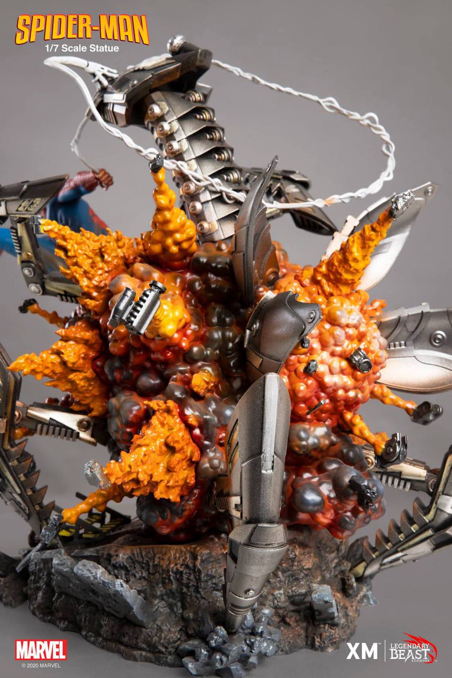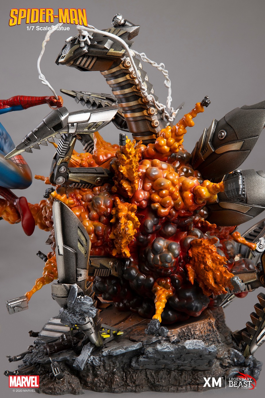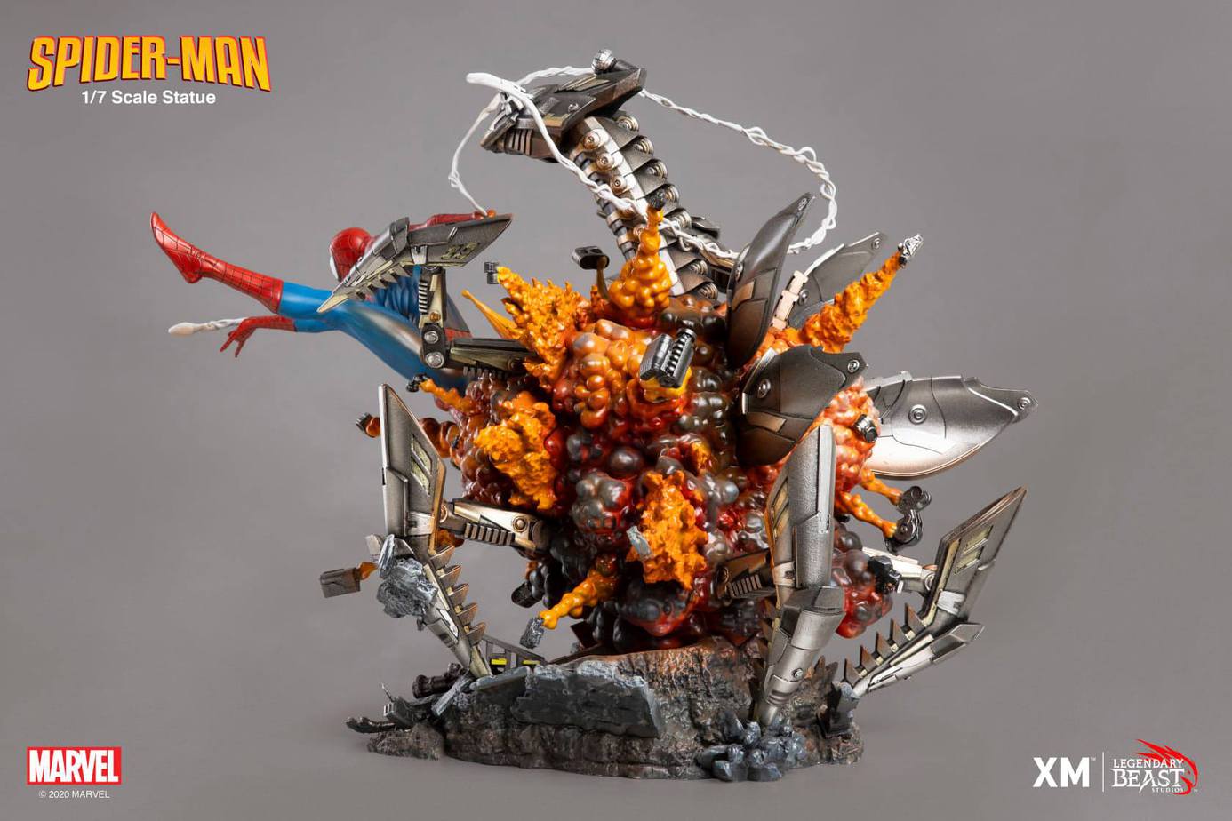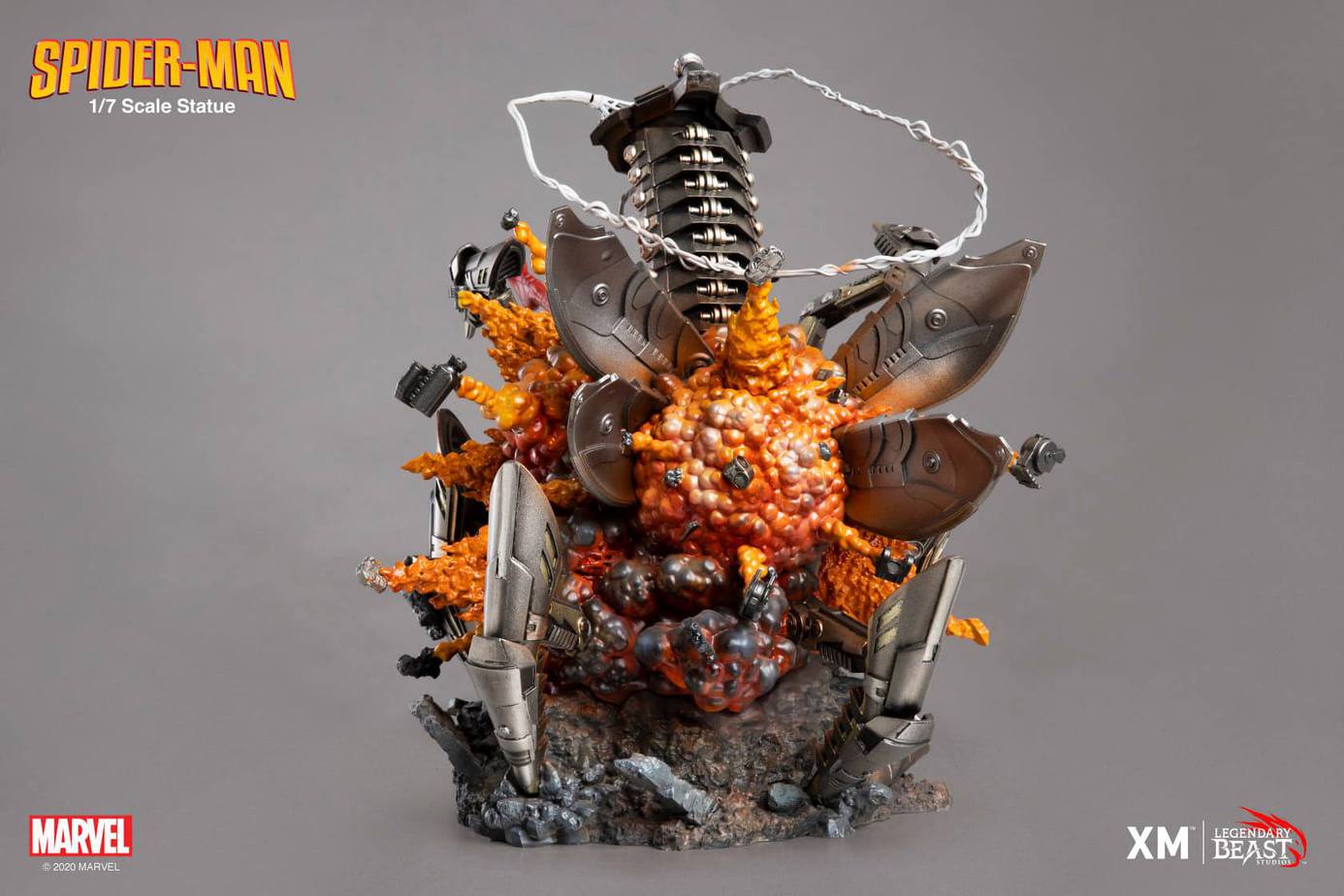 - Eine komplexe und detaillierte Polystone-Statue mit einer zerstörten Straßenbasisszene mit dem Villainous Spider-Bot und dem iconischen Spider-Man.