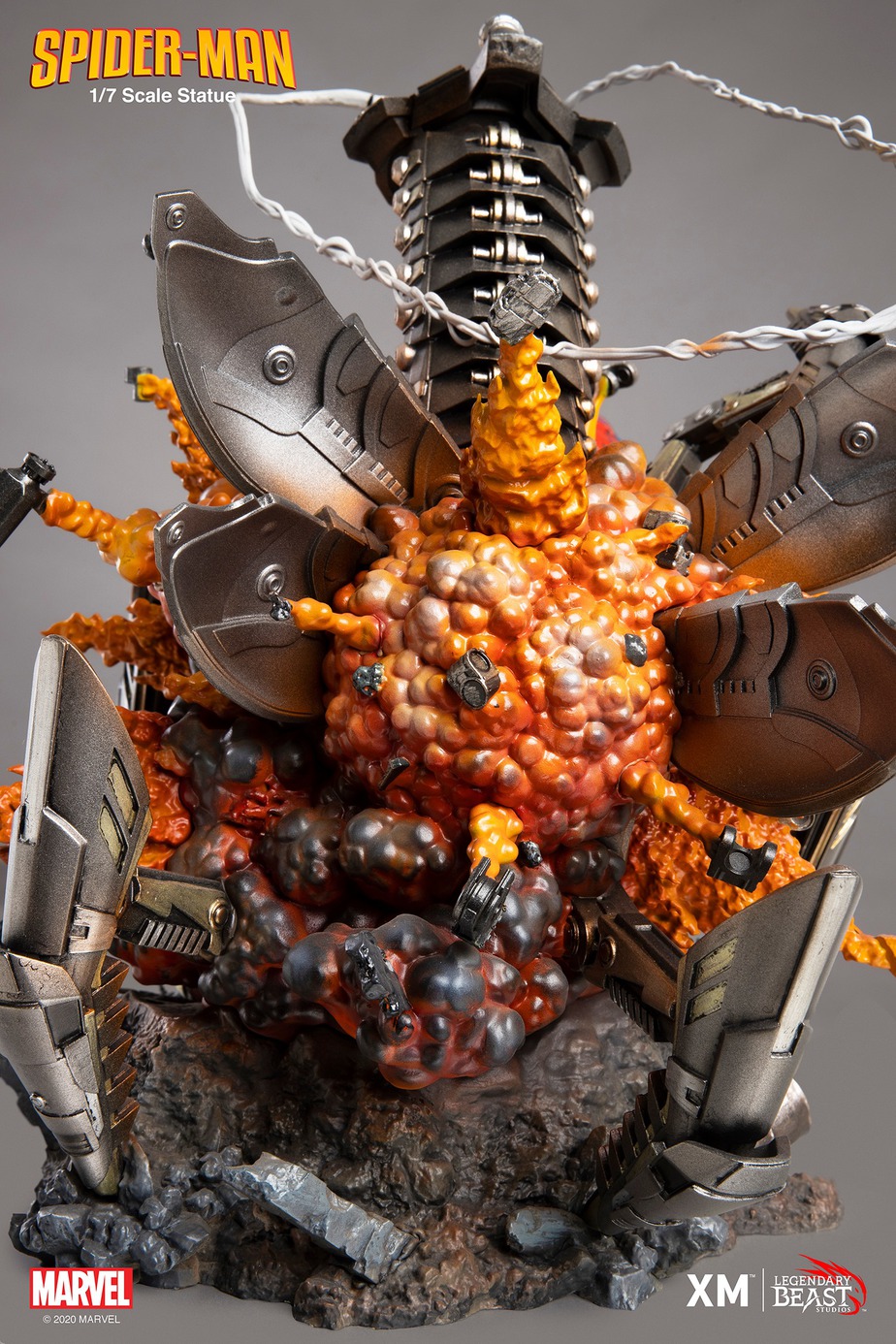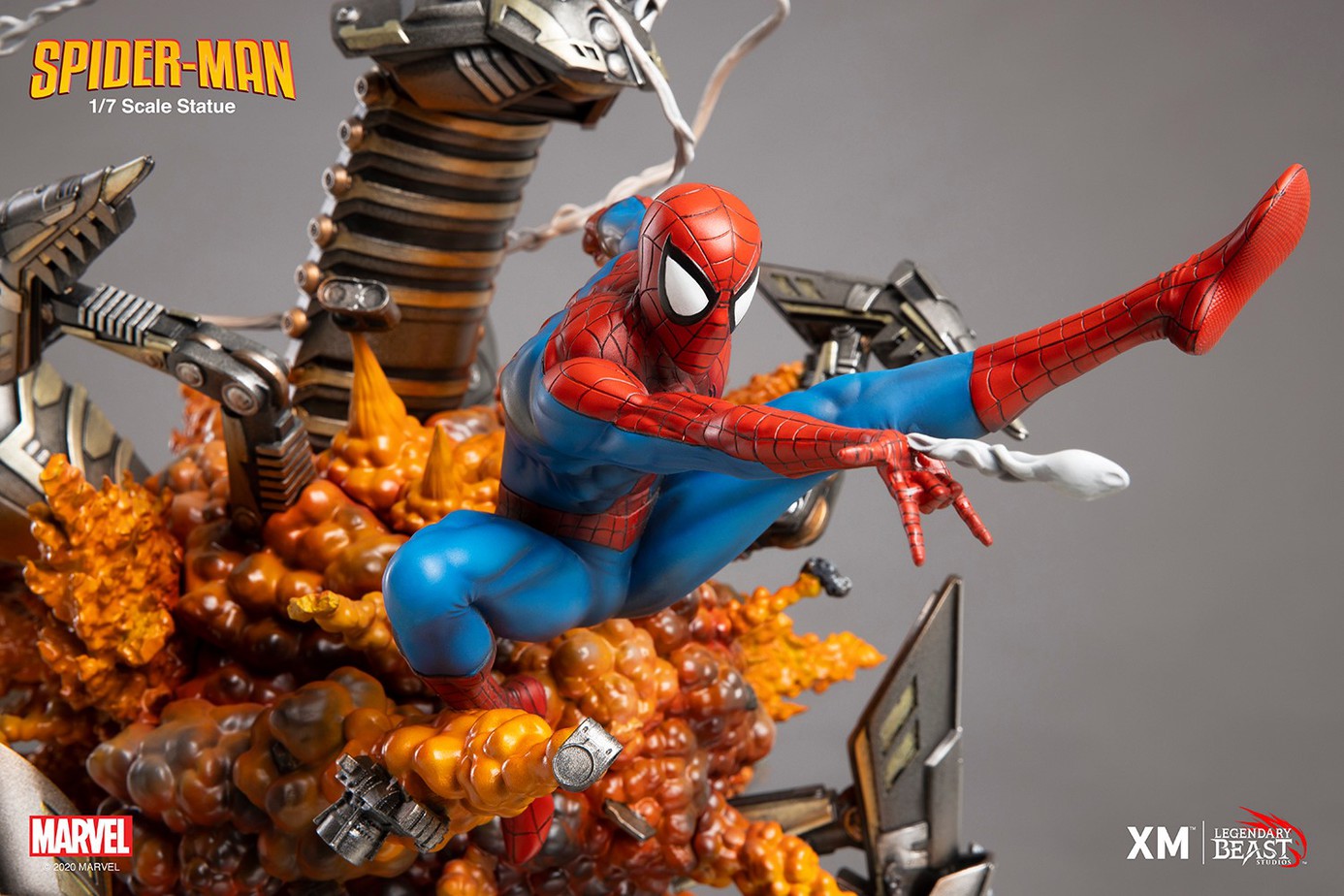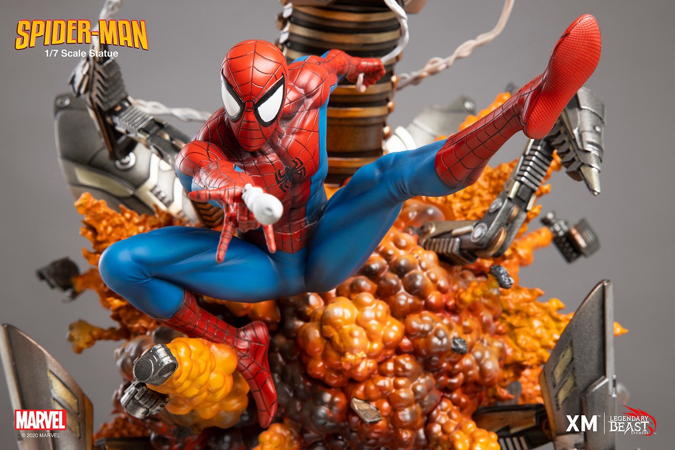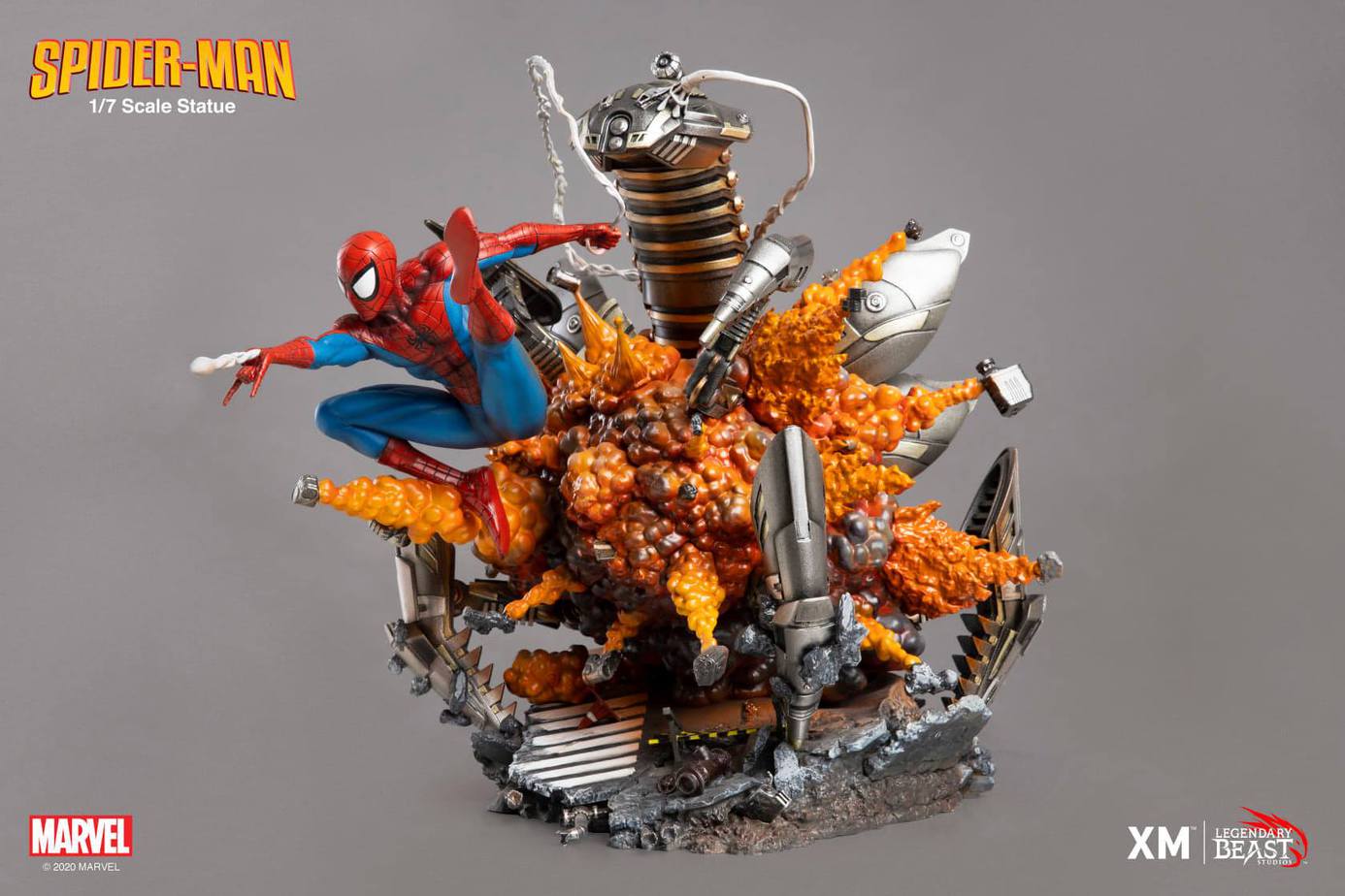 - Eine komplexe und detaillierte Polystone-Statue mit einer zerstörten Straßenbasisszene mit dem Villainous Spider-Bot und dem iconischen Spider-Man.
